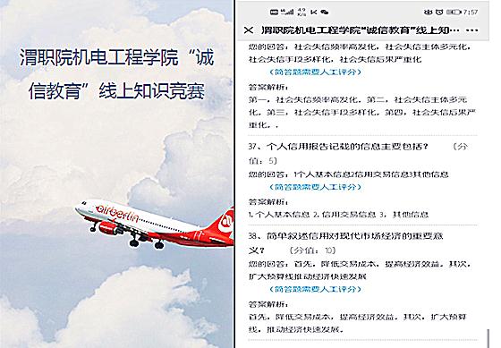 为深入贯彻落实习近平总书记关于高校思想政治教育工作的重要论述以及全国、全省大学生思想政治教育大会精神。“坚持把立德树人作为中心环节,把思想政治工作贯穿教育教学全过程,实现全程育人、全方位育人”。推动我校诚信教育系列活动走向深入,进一步增强广大青年学生的诚信意识和责任意识,营造诚实守信的校园文化氛围。机电工程学院于2020年6月15日晚自习,组织开展以“诚信教育”为主题的线上知识竞赛活动。